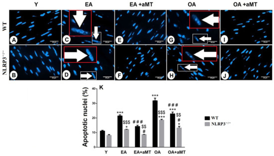 Hoechst fluorescent analysis of the cardiac muscle fibers nuclei showed the normal nuclear appearance in Y WT and NLRP3−/− mice (Figure 7A,B). With aging, cardiac muscle fibers of EA WT and NLRP3−/− animals illustrated signs of apoptosis, where apoptotic cells illustrated cell shrinkage, chromatin condensation, and nuclear fragmentation (Figure 7C,D). These age-related apoptotic changes were more pronounced in the OA groups (Figure 7G,H) and were more considerable in cardiac myocytes of WT mice than NLRP3−/− one (Figure 7K). Interestingly, this age-associated increase of the nuclear apoptosis was countered with melatonin therapy in EA (Figure 7E,F) and OA (Figure 7I,J) WT and NLRP3−/− mice, respectively (Figure 7K).