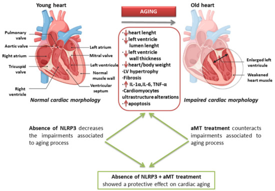 Inflammation has been proposed as a risk factor associated with cardiovascular diseases [12]. Inflammaging is a chronic low-grade inflammation, which develops with aging and describes age-accompanied inflammatory response upregulation [13]. NLRP3 inflammasome is upregulated after several cardiovascular diseases such as atherosclerosis, myocardial infarction, hypertension, chronic heart failure, ischemic heart disease, and diabetic cardiomyopathy [12,14]. Recent studies reported the role of the NLRP3 (nucleotide-binding domain, leucine-rich containing family, pyrin domain-containing-3) inflammasome in cardiovascular diseases and cardiac aging. Lack of NLRP3 in mice has been reported to improve several age-associated degenerative changes with inducing muscle strength and minimizing age-related myopathic fibers [15].