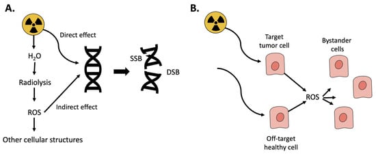 Oxidative stress resulting from ionizing radiation. (A) Radiation can have either direct effect resulting in DNA-damage, single or double-strand breaks (SSB/DSB) or react with water in a process called radiolysis resulting in ROS. (B) Radiation is used to kill tumor cells; however, it can also damage healthy cells either by directly hitting them or by the resulting ROS.