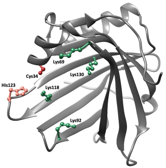 Crystal structure of A1M [87]. Important side chains involved in the protective properties of A1M are highlighted; Cys34 (red), His123 (pink) and Lys69, Lys92, Lys118 and Lys130 (green).