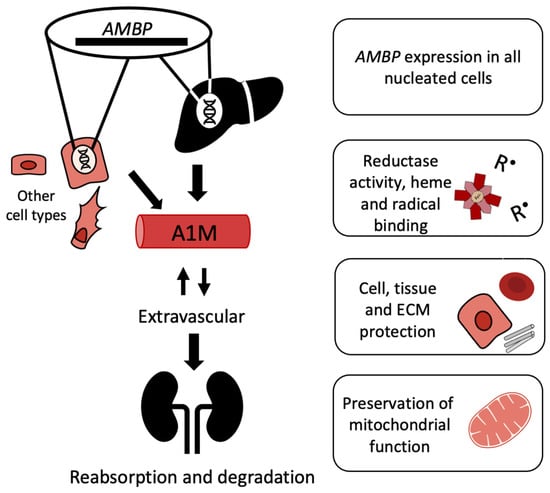 Lifecycle of A1M. Regulation of AMBP expression occurs through the Nrf2-pathway and possibly other pathways. Expression occurs in all nucleated cells and increases in response to heme or oxidative stress. The liver is the main site of synthesis, but other cell types also express AMBP. A1M is extravasated from the bloodstream and can also be internalized into cells. The antioxidant A1M has reductase activity; can bind heme and radicals; protect cells, tissue, and ECM components; and preserve mitochondrial function. A1M passes through the glomerular membrane and is catabolized in the kidneys.
