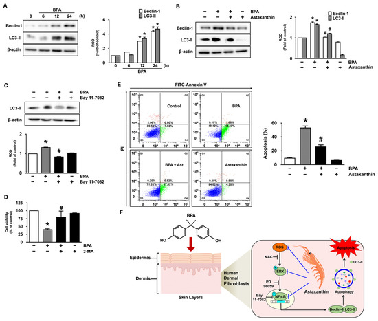 We further tried to clarify whether astaxanthin regulates the protein expression of autophagy responsible for the autophagic cell death triggered by BPA. The levels of protein expression of Beclin-1 and LC3-II, as representative markers of autophagy activation, were investigated in NHDF treated with the BPA. BPA markedly augmented the protein expression of Beclin-1 and LC3-II in a time-dependent manner (Figure 5A). However, the prominent expression of the autophagy-related proteins elicited by BPA was significantly inhibited by treatment with 10 μM of astaxanthin (Figure 5B and Supplementary Materials Figure S1C). Interestingly, we found that the NF-κB inhibitor (Bay 11-7082) significantly suppressed the expression of LC3-II induced by BPA (Figure 5C), indicating that NF-κB phosphorylation enhances transcriptional expression of LC3-II during the autophagic cell death triggered by BPA. We next checked how activated autophagic process coordinates with the apoptotic cell death in BPA-treated NHDF by treating with an autophagy inhibitor, 3-methyladenine (3-MA). We found that 3-MA effectively restores the cell viability decreased by BPA (Figure 5D), indicating that the autophagy activation is required for the dermal fibroblastic damage caused by BPA.