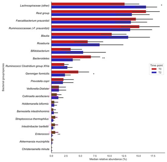 Changes in median relative abundances (%) of bacterial groups before (T0) and after (T2) vitamin C supplementation. Bars indicate median relative abundances of bacterial groups with a corresponding IQR (black lines). * Nominal p-value ≤ 0.05; ** Nominal p-value ≤ 0.01.