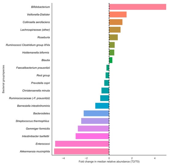 In terms of relative changes in bacterial group abundances, highest fold changes in relative abundances in the positive direction were observed for Bifidobacteriaceae, Veillonella-Dialister, Collinsella aerofaciens, Lachnospiraceae (other), Roseburia and Ruminococci from Clostridium group XIVa, and largest fold changes were observed in the negative direction for Akkermansia muciniphila, enterococci, Intestinibacter bartlettii, Gemmiger formicilis and Streptococcus thermophilus (Figure 2). Of these fold changes, only those of Lachnospiraceae (other), Gemmiger formicilis, Bacteroidetes and Enterococci were statistically significant (p < 0.05).