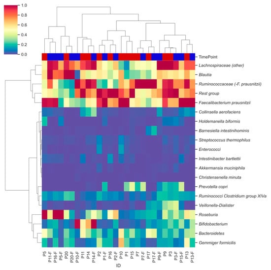 Hierarchically clustered heatmap showing distinct bacterial clusters across participants’ faecal samples. Heatmap columns are coloured by the time point (T0: red; T2: blue) from which each sample was derived. Hierarchical clustering was performed using pairwise Euclidean distances across sample observations. Colouring was based on relative abundances set on a standardized scale.