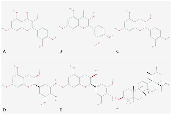 Structures of the most relevant phytochemicals with present in sea buckthorn with medicinal value (A)—quercetin, (B)—isorhamnetin, (C)—catechin, (D)—gallocatechin, (E)—epigallocatechin, (F)—ursolic acid [72,73,74,75,76,77].