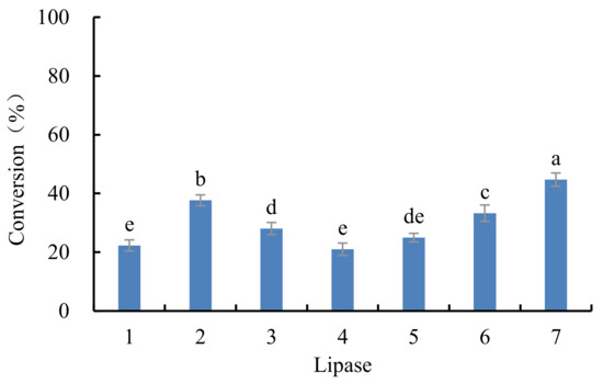 The conversion of EGCG by different lipases (reaction conditions: EGCG, 1 mmol; vinyl stearate, 3 mmol; enzyme, 5.0% (w/w of all substrates)); reaction temperature, 40 °C; reaction time, 48 h in acetonitrile. 1: Novozym 435; 2: TLIM; 3: PSIM; 4: RMIM; 5: RM; 6: AY “Amano” 30SD; 7: DF “Amano” 15. Bars with different letters are significantly different at p < 0.05.