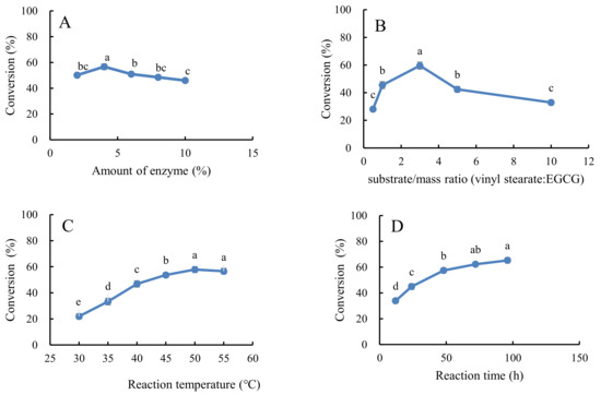 The effects of enzyme usage level with enzyme amount (lipase DF “Amano” 15, % w/w of both substrates). (A), substrate mass ratio (B), reaction temperature (C), and reaction time (D) on the conversion of EGCG. Values followed by different letters within the same line are significantly different (p < 0.05).