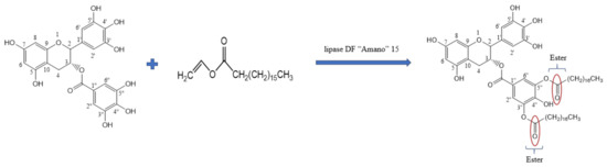 Enzymatic modification has mild reaction conditions and specific reaction characteristics [25]. Conversions of EGCG catalyzed by seven different lipases are shown in Figure 1. Lipase DF “Amano” 15 had the highest catalytic ability of 44.7%, indicating high activity and stability, similar to lipase-catalyzed esterification [26]. Lipase Rhizomucor miehei (RMIM) and Novozym 435 (Candida antarctica) are selective to short and medium fatty acids [27], while DF”Amano” 15 (Rhizopus oryzae) may present high activity on a long alkyl chain.