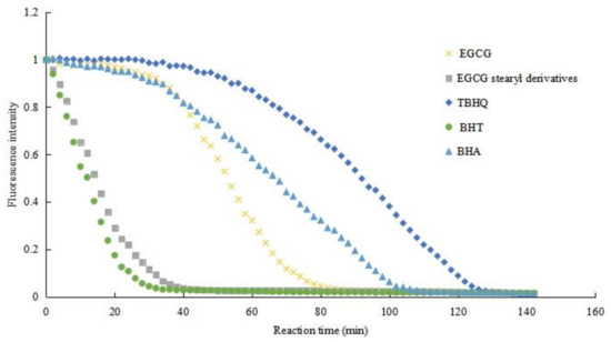 Antioxidant assay methods can be divided into two categories based on chemical reaction mechanisms: electron transfer (ET) and hydrogen atom transfer (HAT) [36]. The antioxidative properties of EGCG, EGCG stearyl derivatives, BHT, BHA, and TBHQ are shown in Table 3. The DPPH has a deep violet color in the solution. Antioxidants can reduce the DPPH radicals to a yellow substance. The DPPH abilities of EGCG, EGCG stearyl derivatives, BHT, BHA, and TBHQ (1 mg/mL) were 90.89%, 51.49%, 9.74%, 72.38%, and 92.99%, respectively. ABTS can be converted to free radical cation by adding sodium persulfate and absorbed at 734 nm. Herein, the ABTS abilities of EGCG, EGCG stearyl derivatives, BHT, BHA, and TBHQ were 90.36%, 65.16%, 56.30%, 60.06%, and 63.01%, respectively. The reducing power assay is a typical ET-based method, where antioxidants in acidic media reduce the iron (Fe3+) ligand complex to a dark blue ferrous (Fe2+) complex, and have a mix absorption at 700 nm. The reducing power values of EGCG, EGCG stearyl derivatives, BHT, BHA, and TBHQ were 2.845, 1.857, 1.710, 2.260, and 2.689, respectively. Hydroxyl radicals can easily be generated via ultraviolet decomposition of H2O2 and have strong reactivity. Herein, the hydroxyl radical scavenging activities of EGCG, EGCG stearyl derivatives, BHT, BHA, and TBHQ were 30.71%, 16.84%, 11.33%, 7.18%, and 73.86%, respectively. The ORAC assay was used to determine the quenching effect of free radicals on fluorescent probes. Antioxidants can inhibit the fluorescence changes caused by free radicals. The results of AAPH-mediated FL oxidation of EGCG, EGCG derivatives, BHT, BHA, and TBHQ (1 mg/mL), are shown in Figure 6.