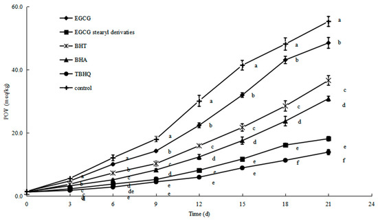 The POV of soybean oil containing EGCG, EGCG stearyl derivatives, and synthetic antioxidants under storage. Values followed by different letters within the same time are significantly different (p < 0.05).
