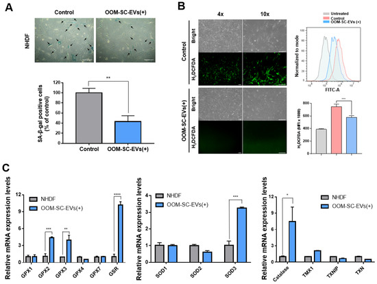 We examined the potential of OOM-SC-EVs in delaying senescence-associated changes in NHDFs. The late-stage NHDFs showed a high number of SA-βgal-positive, blue-colored cells; however, treatment with OOM-SC-EVs led to a significant decrease in SA-βgal positive cells compared with control cells (Figure 4A). We then measured the modulation of ROS generation following OOM-SC-EV treatment and found that high levels of ROS generation in late passage NHDFs were significantly suppressed upon the treatment (Figure 4B). Moreover, we observed that this treatment resulted in a significant increase in the expression levels of antioxidant genes, such as glutathione peroxidase (GPX) 2, GPX3, glutathione S-reductase (GSR), and catalase (Figure 4C). Additionally, OOM-SC-EV-exposed cells showed a marked increase in the expression level of extracellular superoxide dismutase (SOD3) (Figure 4C).