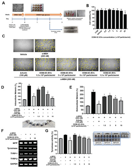 B16F10 cells were seeded onto 12-well plates at a density of 4 × 104 cells/well and cultured with RPMI medium containing 10% FBS overnight. Subsequently, 200 nM α-melanocyte-stimulating hormone (α-MSH) (sigma, M4135) and dose-dependent exposure of OOM-SC-EVs (1.5, 3, 9, and 15 × 108 particles/mL) or arbutin (100 μM) (Sigma, A4256) were administered and incubated for 60 h. Further, to measure extracellular melanin, we transferred 100 µL of culture medium to a new 96-well plate, and absorbance was detected at 405 nm wavelength with a Bio-RAD x-MarkTM spectrophotometer. Additionally, for intracellular melanin measurement, each well was washed with PBS and then dissolved with 200 µL of 1 N NaOH for 1 h at 80 °C. Absorbance was then measured at 405 nm. The extracellular and intracellular melanin levels were normalized to the total protein concentration.