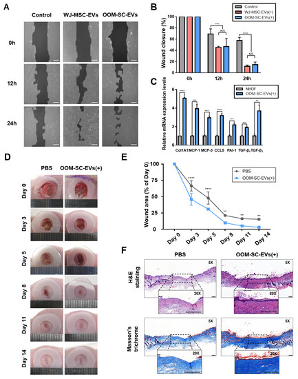 In addition, we confirmed the in vivo wound healing capacity of OOM-SC-EVs using an animal model. After performing a full-thickness skin wound on the mice back, we injected OOM-SC-EVs subcutaneously in the vicinity of the experimental wound and observed a significant wound healing effect (Figure 6D,E). Moreover, we confirmed the marked re-epithelization of the wound following OOM-SC-EVs treatment using hematoxylin and eosin and Masson’s trichrome staining (Figure 6F).