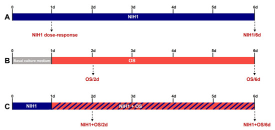 Graphical timeline describing the experimental design. The treatments are color coded: NIH1, blue; OS, orange; NIH1 + OS, blue-dashed orange, basal culture medium, gray. (A) NIH1 effects: Dose-response analysis performed after one day (1d) and long- term analysis performed after six days (NIH1/6d) of incubation. (B) OS model: Pre-treatment with basal culture medium for the first day and OS treatment for the subsequent one day (OS/2d) or five days (OS/6d) of incubation. (C) NIH1 effects in OS: Pre-treatment with NIH1 for the first day and NIH1 + OS treatment for the subsequent one day (NIH1 + OS/2d) or five days (NIH1 + OS/6d) of incubation.