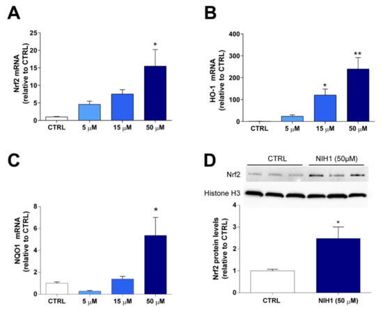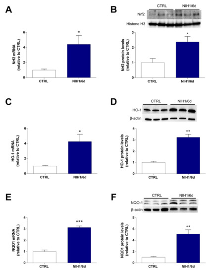 As shown in Figure 3, the expression of Nrf2, HO-1, and NQO1 mRNAs was increased by about 3- to 4-fold after six days of NIH1 treatment, compared to controls (Figure 3A,C,E). This was correlated with an enhanced Nrf2 nuclear translocation, as shown by the Western blot analysis of the nuclear protein fraction (about 2.5-fold; Figure 3B). The NIH1-driven increase of HO-1 and NQO1 mRNAs correlated with the increment in their relative protein content, which was increased by 3- to 5- fold in the treatment groups with respect to controls (Figure 3D,F).