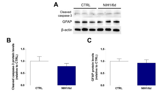 To ascertain whether the administration of NIH1 for six days could interfere with retinal cell viability and/or glial cell stability, the protein levels of cleaved caspase-3 and of GFAP, used as markers of apoptosis and of gliosis, respectively, were evaluated (Figure 4A). The results showed that a six-day administration of NIH1 did not lead to any significant changes in either marker, as the protein levels of both cleaved caspase-3 (Figure 4B) and GFAP (Figure 4C) were similar in NIH1-treated and in control explants. Confirming the cleaved caspase-3 data, also the ratio cleaved caspase-3/procaspase-3 as evaluated with Western blotting (Figure S2) and the mRNA levels of caspase-3 evaluated with qPCR were similar in control and NIH1/6d explants (Figure S3).