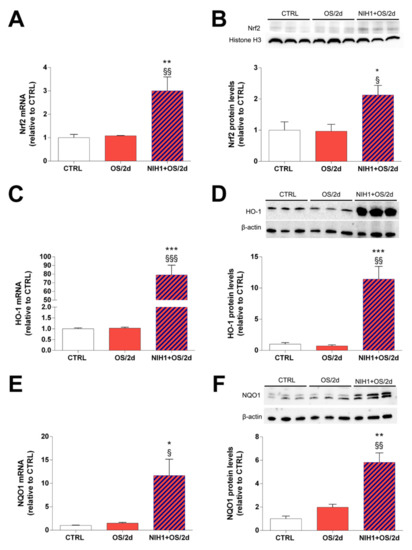 As shown in Figure 5A,C,E, the OS/2d group did not display any significant alterations in Nrf2, HO-1, or NQO1 mRNA compared to controls. Conversely, the treatment with NIH1 for two days produced a change in Nrf2, HO-1 and NQO1 expression (NIH1 +OS/2d bars in Figure 5A,C,E), which significantly increased by 3-, 79- and 11-fold, respectively. The nuclear levels of Nrf2, were comparable to those of controls in the OS/2d group, while they were increased by 2-fold in NIH1 + OS/2d explants (Figure 5B). Similarly, the HO-1 and NQO1 protein levels were unaltered in OS/2d explants compared to controls, while they were drastically enhanced by 11- and 6-fold following treatment with NIH1 (NIH1 + OS/2d bars in Figure 5D,F).