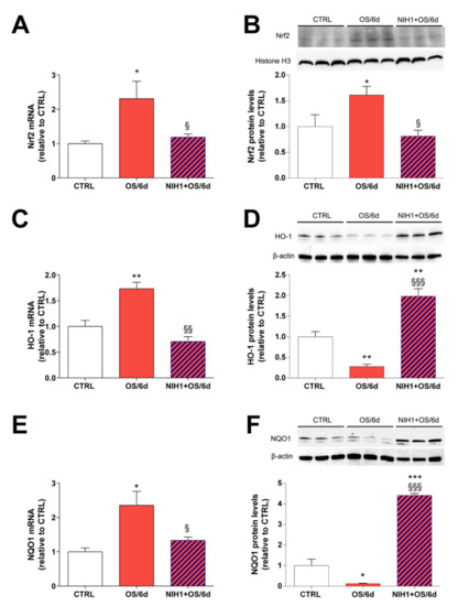 In contrast to OS/2d explants, OS/6d explants showed an overall increase by about 2-fold in Nrf2, HO-1 and NQO1 mRNA expression, while the OS-driven antioxidant gene expression was fully counteracted in NIH1 + OS/6d explants (Figure 6A,C,E). This modulation of Nrf2 and antioxidant gene expression was consistent with the observed levels of Nrf2 nuclear protein content, which was increased by about 1.5-fold in OS/6d explants, compared to controls, and restored to basal levels after six days of treatment with NIH1 (NIH1 + OS/2d bar in Figure 6B). Interestingly, the protein levels of HO-1 and NQO1 in OS/6d and in NIH1 + OS/6d explants diverged from the relative qPCR data, since they were significantly reduced in OS/6d explants, while they were dramatically increased in NIH1 + OS/6d explants (Figure 6D,F).