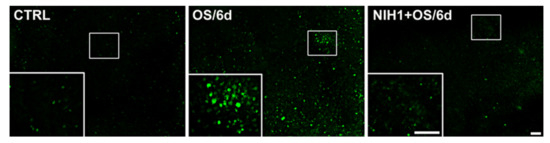 Effect of NIH1 on ROS levels. Visualization of ROS in CTRL, OS/6d, and NIH1 + OS/6d explants using the DCFH-DA assay. Insets are higher-power images of the boxed areas. Scale bar, 100 µm (50 µm for the insets).