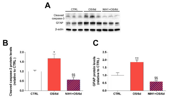 In order to evaluate the effect of NIH1 on apoptosis and reactive gliosis in stressed retinal explants, we analyzed the protein levels of cleaved caspase-3 and of GFAP. As expected, the levels of both cleaved caspase-3 and GFAP increased significantly in OS/6d explants, while these increases were completely prevented by treatment with NIH1 (Figure 8). An almost identical pattern of changes was observed for the ratio cleaved caspase-3/procaspase-3 evaluated with Western blotting (Figure S3) and for the levels of caspase-3 mRNA expression as evaluated with qPCR (Figure S4).