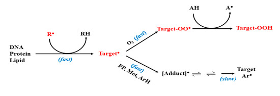 In the reducing environment of cells and tissues, peroxyl radicals are commonly converted to hydroperoxides. All these species, namely, the C-centred and other free radicals, peroxyl radicals and hydroperoxides, have the capacity to propagate the damage triggered by R●, with peroxyl radicals believed to be the main carriers of damage in living organisms; many of the commonly used assays for the formation of free radicals in cells and tissues depend on the detection of peroxyl radicals and hydroperoxides [16,17].