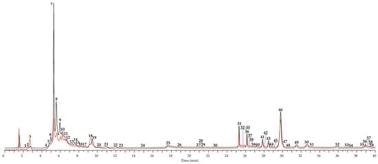 Various flow values were used for the nebulizing gas (N2) 3 L/min, heating gas (air) 10 L/min, and collision-induced dissociation gas (Ar) 0.3 mL/min. The source voltage of registered mass spectra was 3 kV, and the collision energy was −10–35 eV for the scanning range of m/z 80–1900. The managing of the LC-MS system was realized by LabSolution’s workstation software (Columbia, MD, USA) equipped with the inner LC-MS library.
