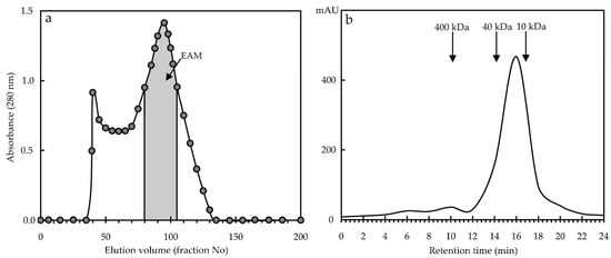 The elution profile of the total melanoidin fraction of E. angustifolium fermented leaves on a Sephadex G-150 column (a) and high-performance gel permeation chromatography with photodiode array detection (HPGPC-PDA) profile of purified melanoidin (EAM) (b).