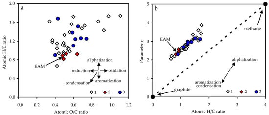 - Burnham, A.K. Van Krevelen diagrams. In Encyclopedia of Petroleum Geoscience. Encyclopedia of Earth Sciences Series; Sorkhabi, R., Ed.; Springer: Cham, Switzerland, 2018. [Google Scholar] [CrossRef]