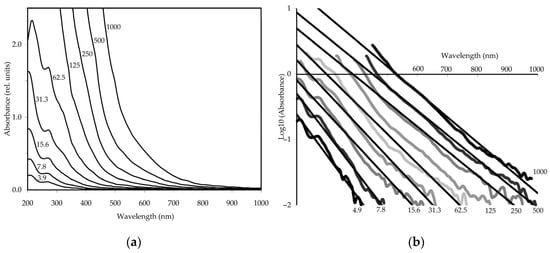 The UV-Vis spectra in the spectral range 190–1000 nm were studied using a UV-Vis spectrophotometer SF-2000 (OKB Spectr) using a quartz cell (10 mm) and series of melanoidin EAM solutions in bidistilled water (3.9–1000 μg/mL) with bistilled water was as a blank. The optical density data was used to build a graph of the optical density logarithm (common logarithm) against the wavelength followed by the determination of the linear regression equation and the value of the slope, which is a logarithmic slope of absorbance.