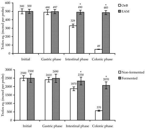 An aliquot (5 mL) of the retentate (non-dialyzed part of intestinal phase sample), fecal slurries (donated by healthy volunteers []; 1 g in 5 mL of brain heart infusion) and brain heart infusion (15 mL) were mixed and anaerobically incubated at 37 °C for 48 h using BD GasPakTM EZ anaerobe container system sachets (Franklin Lakes, NJ, USA) (colonic phase). An aliquot (100 μL) of reaction mixture before simulation and after the gastric, intestinal, and colonic phase were measured coulometrically to determine the trolox equivalent content in probe (Section 2.11).