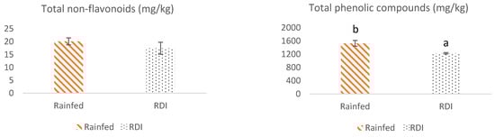Mean values of total phenolic compounds and total content (mg/kg) of different groups of phenolic compounds in Monastrell grapes. Bars represent the standard deviations (n = 4). Different letters (a and b) indicate significant differences between grapes under non-irrigation (rainfed) and regulated deficit irrigation (RDI) regimes (p ≤ 0.05). When there is no difference between treatments (p > 0.05), no significance letters are shown.