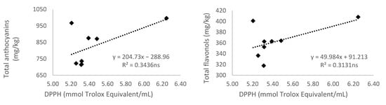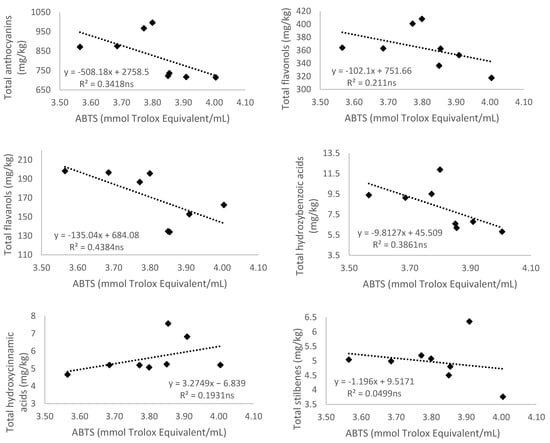 Relationship of the 2,2′-Azino-bis(3-ethylbenzthiazoline-6-sulfonic acid) (ABTS) (mmol Trolox/mL) and total anthocyanins, flavonols, flavanols, hydroxybenzoic and hydroxycinnamic acids, stilbenes, non-flavonoids, and content of total phenolic compounds (mg/kg) of Monastrell grapes. Values of the coefficient of determination (R2) are presented. Lines of linear regression are shown: there are no significant differences (p > 0.05, ns).