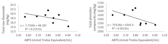 Correlations between ABTS values and the total of different groups of phenolic compounds were established (Figure 3). However, no significant relationships were found between the antioxidant activity measured with the ABTS method and the total of the different groups of phenolic compounds determined, nor with the total of all of them.