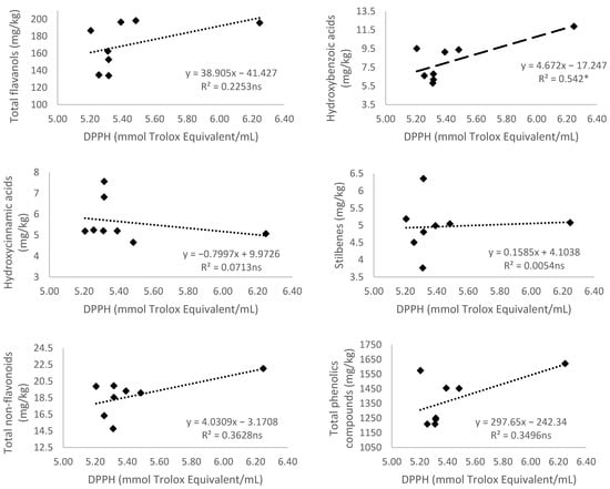 Relationship of the 2,2-diphenyl-1-picryl-hydrazyl-hydrate (DPPH) (mmol Trolox/mL) and total anthocyanins, flavonols, flavanols, hydroxybenzoic and hydroxycinnamic acids, stilbenes, non-flavonoids, and content of total phenolic compounds (mg/kg) of Monastrell grapes. Values of the coefficient of determination (R2) are presented. Lines of linear regression are shown: (- - -) when relationships are significant (p < 0.05, *), or (⋯) when there are no significant differences (p > 0.05, ns).
