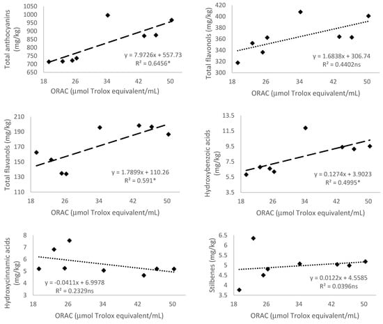 Relationship of the 2,2′-Azobis(2-amidinopropane) dihydrochloride (AAPH)—Oxygen radical absorbance capacity (ORAC) (μmol Trolox/mL) and total anthocyanins, flavonols, flavanols, hydroxybenzoic and hydroxycinnamic acids, stilbenes, non-flavonoids, and content of total phenolic compounds (mg/kg) of Monastrell grapes. Values of the coefficient of determination (R2) are presented. Lines of linear regression are shown: (- - -) when relationships are significant (p < 0.05, *; p < 0.01, ** or (⋯) when there are no significant differences (p > 0.05, ns).