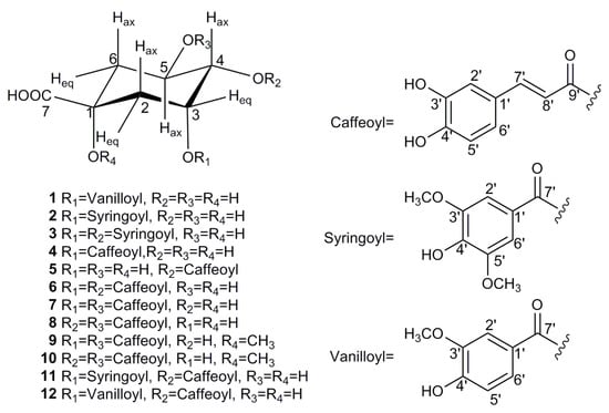 - Pauli, G.F.; Poetsch, F.; Nahrstedt, A. Structure assignment of natural quinic acid derivatives using proton nuclear magnetic resonance techniques. Phytochem. Anal. 1998, 9, 177–185. [Google Scholar] [CrossRef]