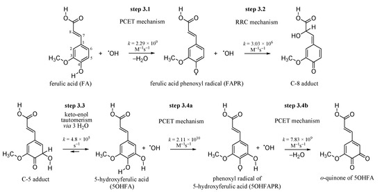 Underlying mechanisms by which FA may suppress UV-induced •OH radical damage to skin cells are not well understood. In this report, the possible fate of FA under •OH radicals attack was kinetically investigated. The success of any molecule to inactivate •OH depends on its concentration at sites of •OH generation, in relation to that of all other nearby competing biomolecules [33]. We assumed that by maintaining a high local concentration within the skin after topical application and/or a sufficient concentration in the systemic circulation [25,34,35], FA could be able to intercept more than a minor percentage of generated •OH. Inactivation of •OH radicals was investigated via several mechanisms including hydrogen atom transfer (HAT), proton coupled electron transfer (PCET), radical adduct formation (RAF), and radical-radical coupling (RRC) [34,36,37].