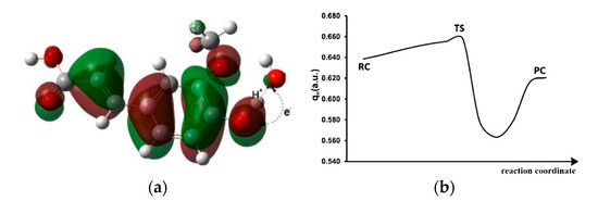 The change of QTAIM positive charge along the IRC of the studied reaction path is shown in Figure 2b. The migrating hydrogen atom shows a substantial positive charge, typical for proton migration [59,60]. Positive charge in the RC (qH = 0.64 a.u.) increases in TS (qH = 0.66 a.u.) and then decreases in the PC (qH = 0.62 a.u.). This confirms that hydrogen abstraction from the 4-OH group of FA by the •OH radical takes place via the PCET mechanism. The HAT proceeds with a small positive charge (qH < 0.5 a.u.) for the transferring H-atom in the TS structure [61].