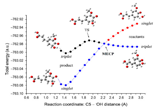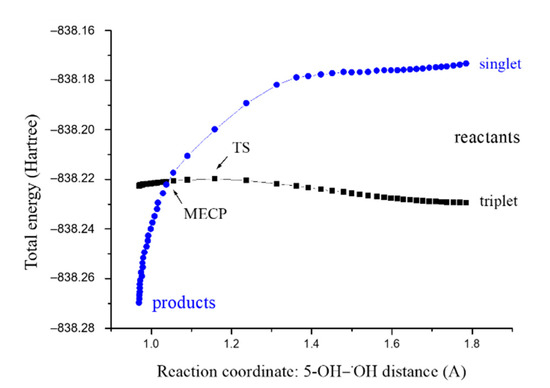 The geometry of the MECP (i.e., the conformation of the molecular system at the intersection between the reactant (triplet) and the product (singlet) PES), plays the same role as the transition state in reactions proceeding on a single PES [64]. Locating the MECP structure is necessary for calculating the reaction rate constant [65,66]. To identify the MECP, firstly, the reaction pathway is traced toward the RC and the PC starting from the triplet TS, and each point encountered along the IRC path of the TS was submitted to a single point energy calculation with the singlet electronic state [51]. The C5−•OH distance was selected as the reaction coordinate. By this procedure, the MECP is predicted to appear at the C5−•OH distance of 2.09917 Å (Figure S2). By another approach [67] (i.e., full scan procedure starting from RC geometry in singlet state and going to PC (using the C5−•OH distance as the reaction coordinate)), obtained MECP appears at a distance of 2.23961 Å (Figure 3). Afterwards, to achieve a more precise estimate of the rate constant, the structure closest to the initially estimated MECP was used as a starting geometry in the MECP search using Harvey’s original code [64], implemented in the EasyMECP program [52]. In this way, the more accurate MECP appears at the C5−•OH distance of 2.23494 Å and is used as the TS in estimating the rate constant. The obtained results are summarized in Table 1.
