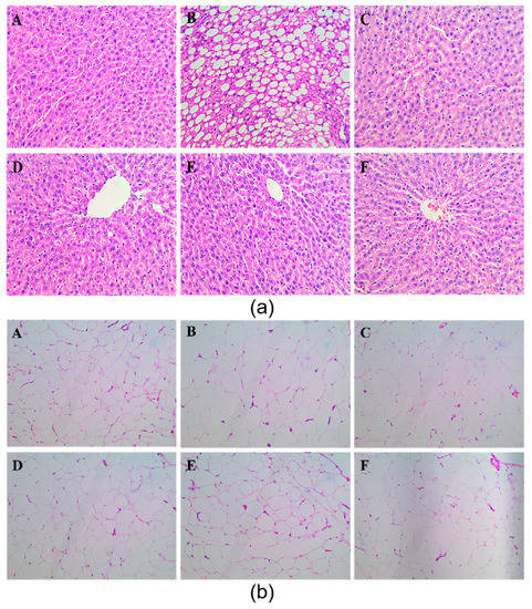 Figure 2. Pathological observation of liver (a) and peri-testicular fat (b) A:the normal control group(NC); (B): the model control group(MC); (C): Chrysanthemum flavone intervention group(CF); (D):Luteolin intervention group; (F): Luteoloside intervention group; (E): Simvastatin intervention group.