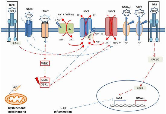 The main factors modulating KCC2 and NKCC1 synthesis and activity, in relation with anomalies described in neurological and neurodevelopmental disorders. Oxidative stress/ROS is symbolized by lightning bolts; blue bolts indicate a loss-of-function effect, red bolts indicate a gain-of-function effect. The boxes surrounding IGFR and TrkB indicate that IGF-1 and BDNF signaling are both decreased in ASD and in other neurodevelopmental disorders.