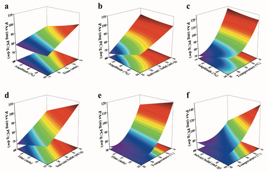 3.6.2. Interaction of Independent Variables on Extraction PAs in the RSM Model