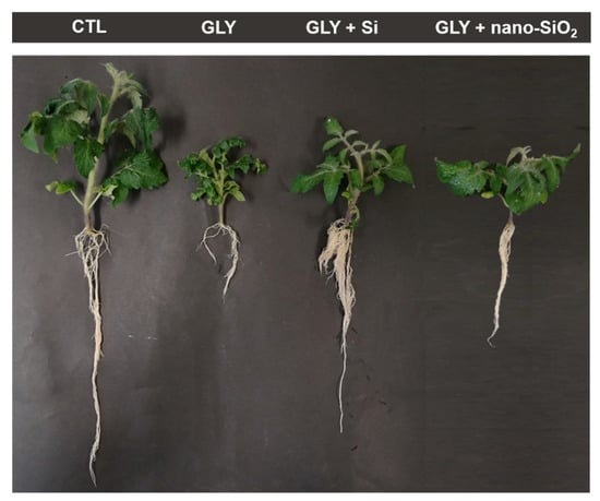 S. lycopersicum plants after four weeks of growth (CTL—control plants; GLY—plants exposed to GLY alone; GLY + Si—plants exposed to GLY and treated with Si; GLY + nano-SiO2—plants exposed to GLY and treated with nano-SiO2).