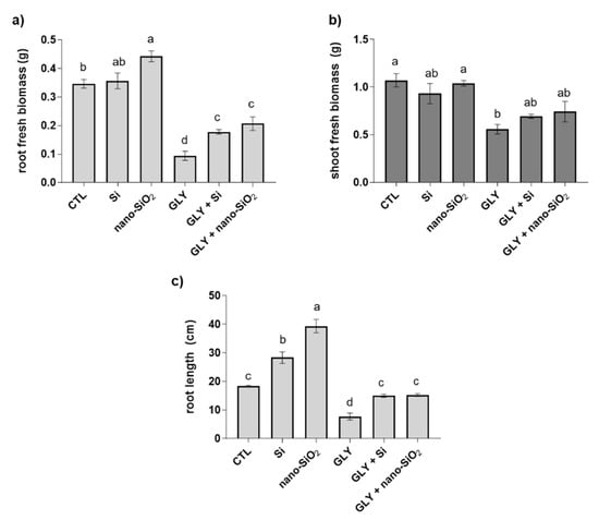 Biometric parameters of S. lycopersicum plants after four weeks of growth [CTL—control plants; GLY—plants exposed to GLY alone; GLY + Si—plants exposed to GLY and treated with Si and GLY + nano-SiO2—plants exposed to GLY and treated with nano-SiO2]. (a) Root fresh biomass; (b) shoot fresh biomass and (c) root length. Data presented are mean ± STDEV (n ≥ 3). Different letters (a–d) above bars indicate significant statistical differences between treatments (Tukey: p ≤ 0.05).