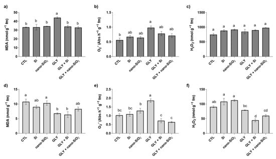 The production of O2•− was significantly changed in shoots [F (5, 23) = 4.25; p < 0.05] and roots [F (5, 20) = 12.88; p < 0.05] (Figure 4b,e). The levels of O2•− were higher in plants exposed to GLY alone, with values exceeding by 75 and 80% those found in shoots and roots of CTL plants, respectively. However, when plants were treated with Si or nano-SiO2, the levels of this ROS were kept identical to the CTL, especially in roots, where each treatment resulted in a decrease of around 60% compared to GLY-exposed plants (Figure 4b,e).