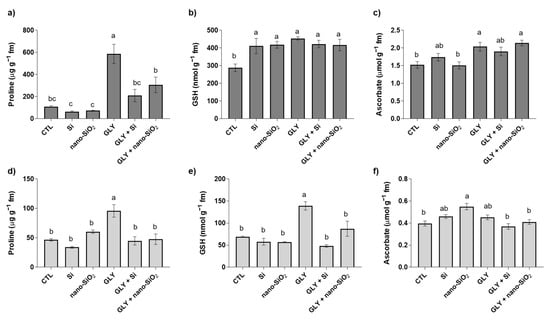 Pro levels, illustrated in Figure 5a,d, were changed in response to GLY [shoots: F (5, 14) = 15.44; p < 0.05; roots: F (5, 18) = 12.14; p < 0.05], with values around 5.3- and 2.0-fold of those of the CTL, in both shoots and roots, respectively. Upon co-treatment with Si or nano-SiO2, Pro content was reduced in relation to the plants exposed to GLY alone, showing values identical to the CTL.