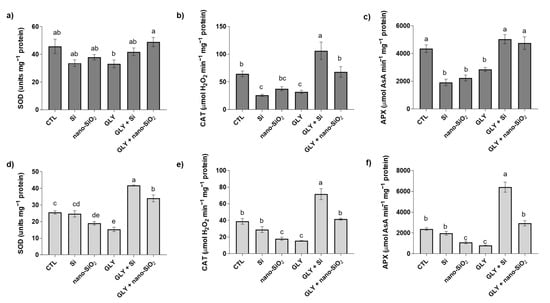 As can be observed in Figure 6a, SOD activity was significantly changed in the shoots [F (5, 14) = 3.99; p < 0.05], but no differences were recorded between GLY and the CTL. However, plants co-treated with Si, especially nano-SiO2, showed increased activity of this enzyme in comparison with plants only exposed to the herbicide. In roots [F (5, 13) = 49.60; p < 0.05], GLY significantly inhibited SOD activity by 40% over the CTL (Figure 6d). Once again, plants simultaneously exposed to Si or nano-SiO2 and GLY displayed a significantly improved SOD activity, with values even higher (up to 63%) than those found in the CTL roots (Figure 6d). Moreover, the application of nano-SiO2 alone reduced the activity of this enzyme.