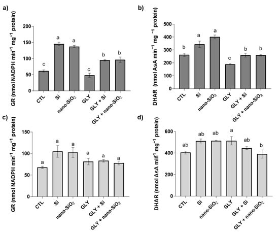 Lastly, concerning DHAR, GLY induced a decrease in its activity (ca. 30%) over the control in shoots; however, the application of Si or nano-SiO2 alone or in combination with GLY exposure contributed to enhanced activity of this enzyme, with values exceeding those of GLY-treated plants by 37% (Figure 7b). In general, no major changes were found in roots (Figure 7d).