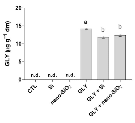 As can be observed, GLY was not detected in shoots of any experimental group (Figure 8). In contrast, roots of plants exposed to the herbicide alone displayed GLY levels up to 14.2 µg g−1 d.w. However, in response to the foliar application of Si or nano-SiO2, GLY bioaccumulation was reduced, with significant decreases of 17 and 13%, respectively. AMPA was not detected in any sample, being below the detection limit.